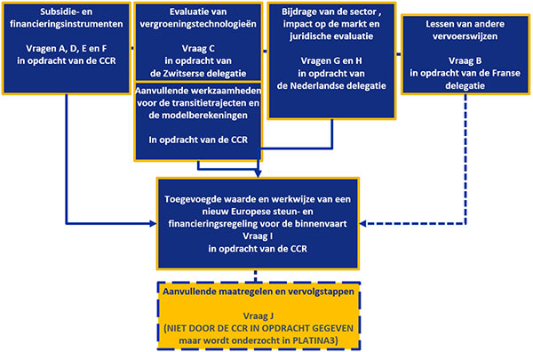 De drie studies zijn tegelijkertijd uitgevoerd. Zij maken deel uit van het overkoepelende studieproject van de CCR over de energietransitie naar een emissievrije binnenvaartsector waarbij de volgende aspecten centraal staan: